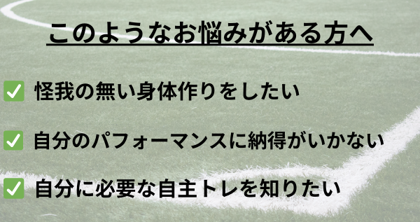 例)足が速くなりたい、身体を柔らかくしたい、シュート力が弱いなど