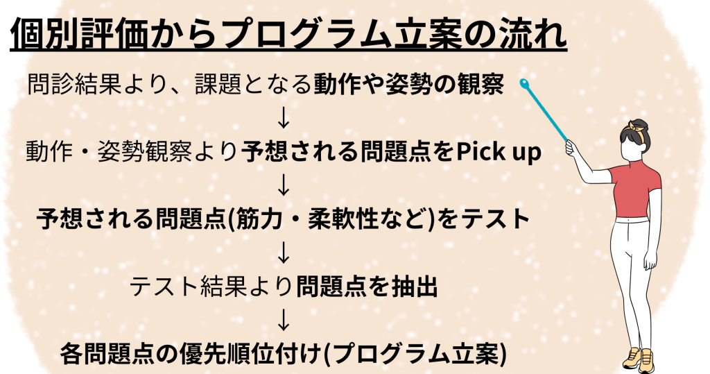 「個別評価に基づき基礎的能力(走る・跳ぶなど)やスポーツパフォーマンスの向上、障害予防をサポート」