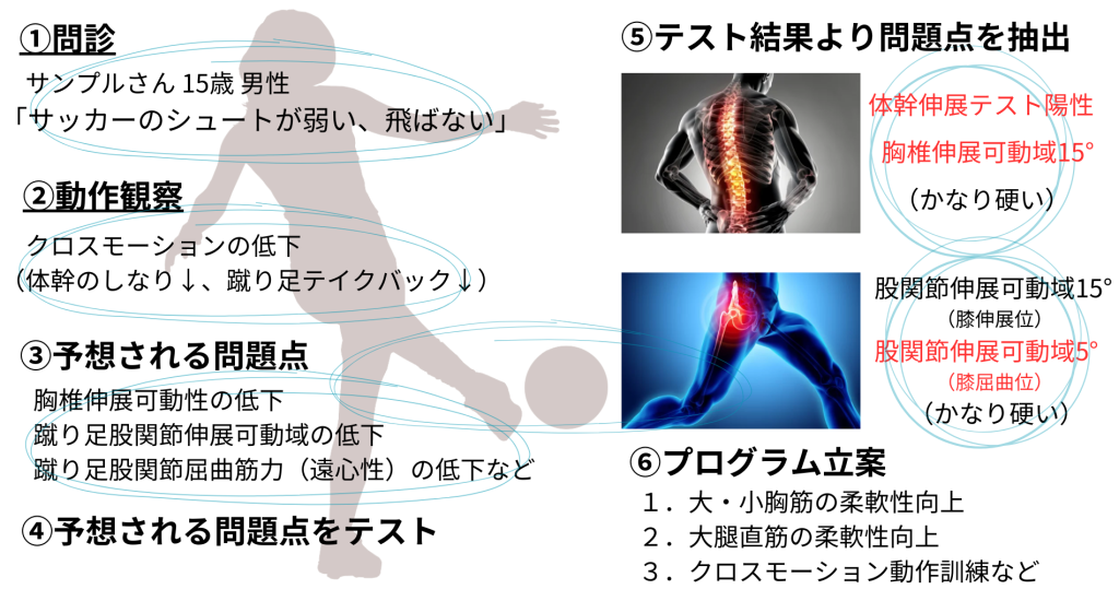 ex:サンプルさんの場合→胸椎・股関節の伸展可動性が乏しいため、腰部に過剰なストレスが加わり、腰部痛を引き起こす。非効率的なキックモーションであるため股関節や膝を痛めやすい、など
